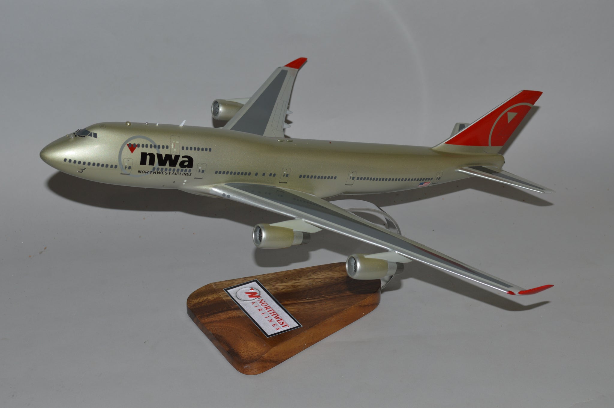 Boeing 747-400 Northwest Airlines airplane model. See the world in style with the 747-400 Atlas Air! Crafted with mahogany wood and hand painted for an exquisite look, this plane is the perfect way to make your next flight a luxurious experience. Soar to new heights with this incredible aircraft!