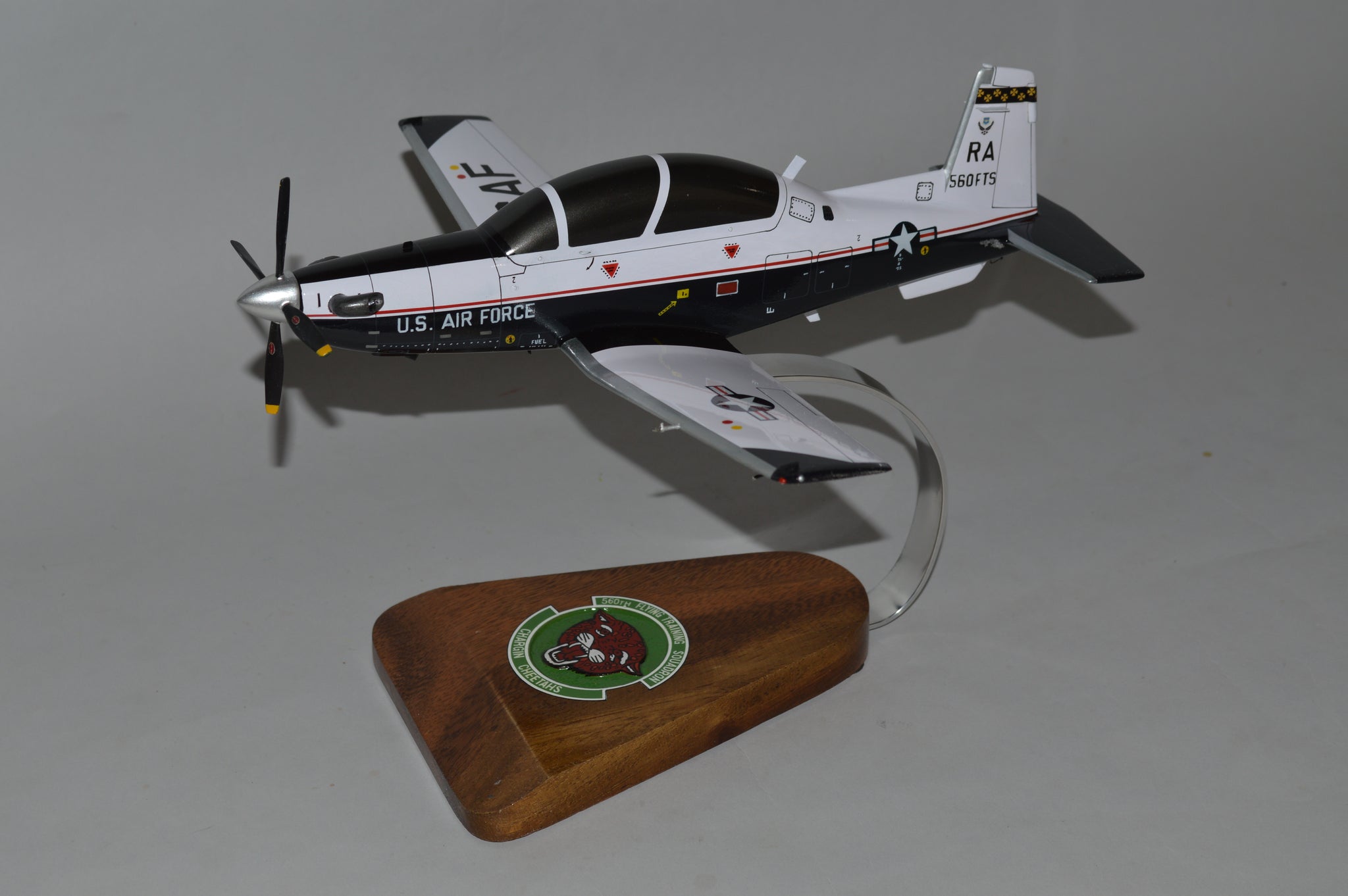 Item Number: 2323Raytheon T-6 T-6A T-6B Texan 560th FTS airplane model. The Raytheon Aircraft Company [formerly Beechcraft] T-6A Joint Primary Air Training System (JPATS) turboprop is designed as a dedicated training aircraft possessing jet-like handling characteristics. Replacing the Air Force's T-37 and the Navy's T-34C aircraft, which are 37 and 22 years old, respectively, the T-6A will offer better performance and significant improvements in training effectiveness, safety, cockpit accommodations and operational capabilities. Seven hundred and forty T-6A aircraft will be purchased by the United States Air Force and the United States Navy. The Air Force and Navy transition to the T-6A is expected to take approximately 10 years. The Air Force will steadily replace T-37s with T-6s at all Air Education and Training Command joint specialized undergraduate pilot training bases.
