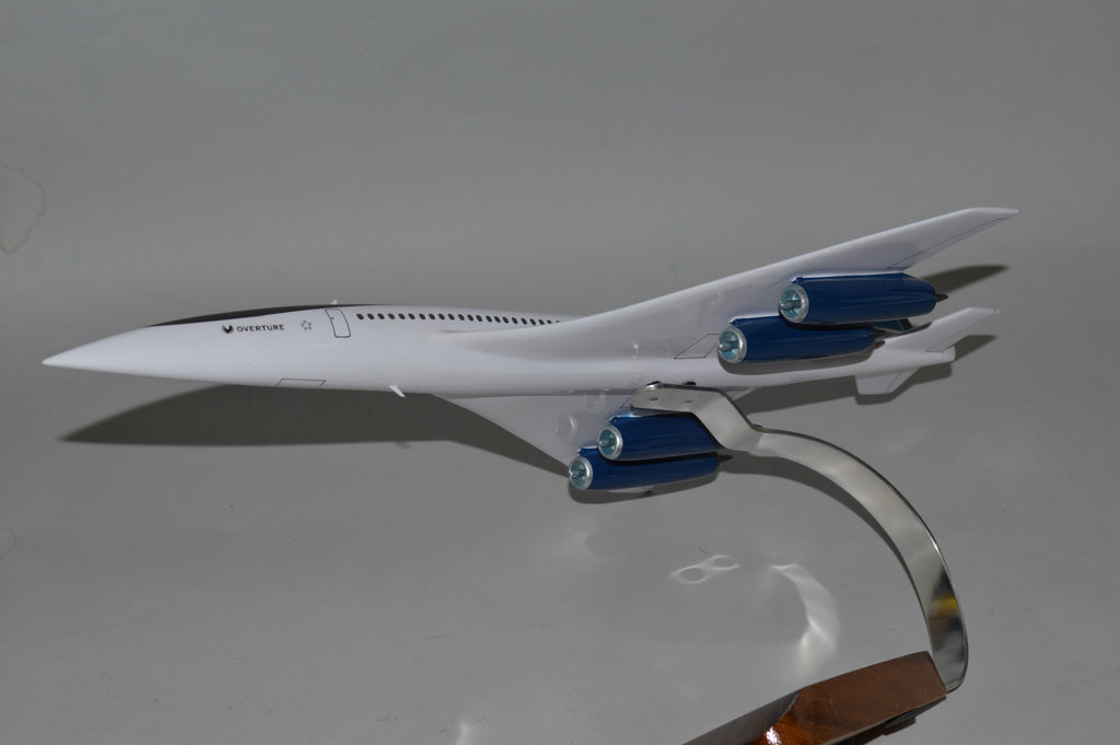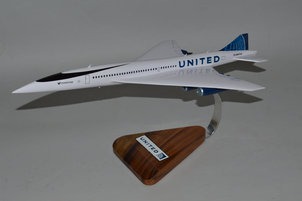 Boom Overture United airplane model. The Overture, designed to carry from 65 to 80 passengers, will travel at Mach 1.7, or about 1,300 miles per hour, at 60,000 feet. At those speeds, it will be able to fly from London to New York in three and a half hours, nearly cutting flight time in half.